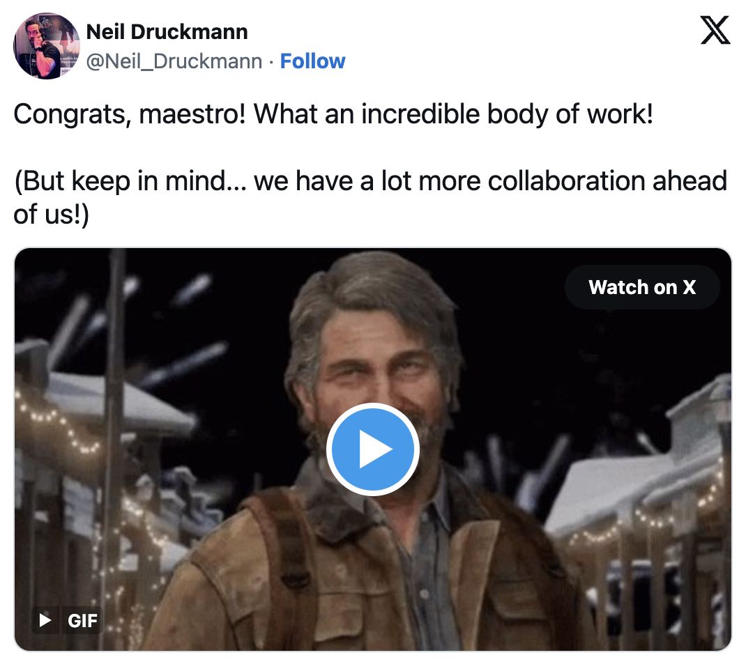 В новом посте на X Дракманн поздравил давнего соавтора и композитора The Last of Us Густаво Сантаолалью с получением премии «Грэмми». Наряду с этим поздравительным посланием Дракманн добавил, что у этой пары «еще многое впереди».